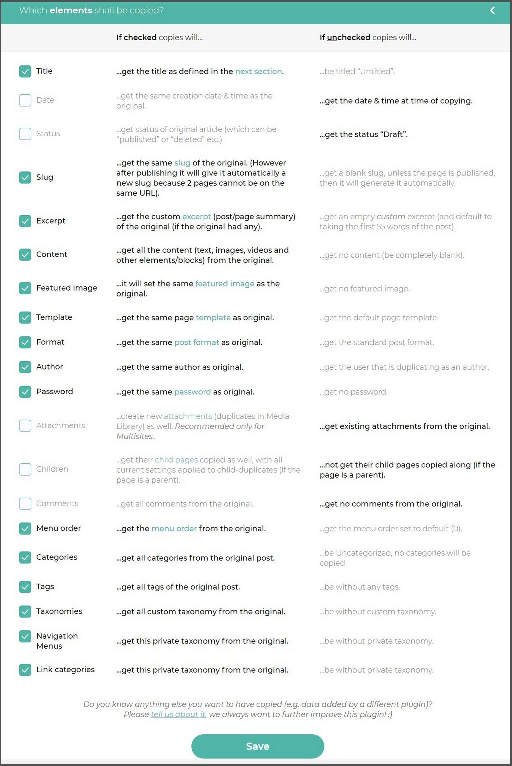 WordPress 的文章其實有許多的地方可以做設定,但是當我們複製頁面時,如果複製到本來就要修改的內容時,反而會多一道修改的步驟,尤其是在建立大量內容的時候也是十分繁雜的,Duplicate Post 可以預先選擇要複製的項目,包含: