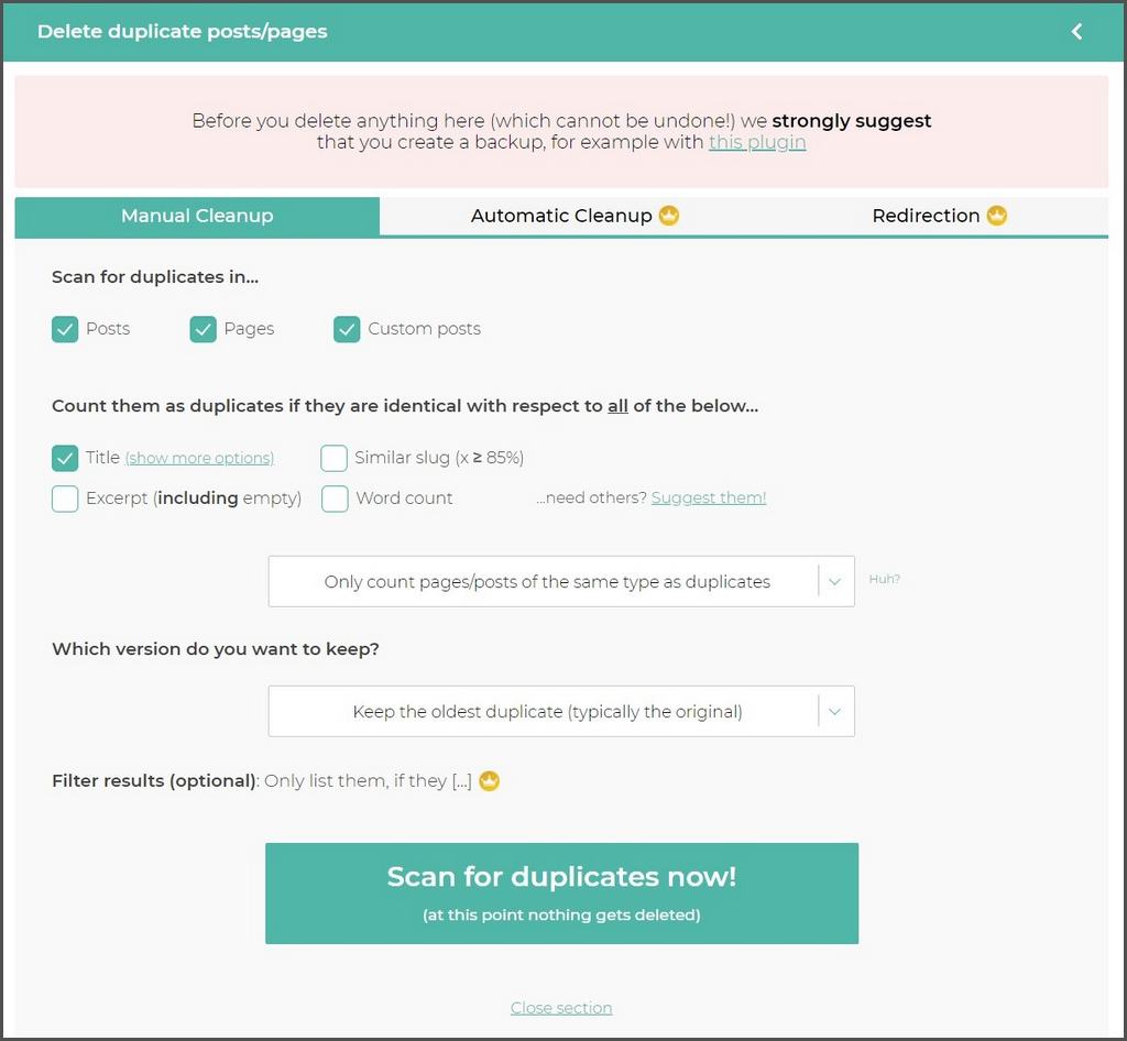 如果你一時之間複製了太多的內容,想要刪除,Duplicate Post 可以讓你快速的清理複製出來但是沒有修改到的文章與頁面,不過要注意的是,刪除的內容就沒辦法再回復了,所以在使用這項功能前一定要小心一點。