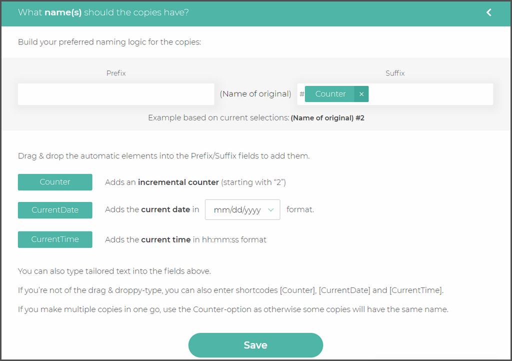 為了與原本的內容作區隔,新複製出來的也面與文章通常會賦予其他的名稱,預設會在原本的標題後方加上後輟,你也可以修改後輟文字或是加入日期格式等做為區隔。