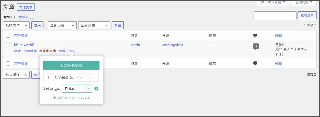 當一切設定都完成之後,當你開啟文章或是頁面設定時,你會發現文章下方會多出一個 copy 的按鈕,只要一次點擊就可以立刻替你複製一篇相同的文章內容。