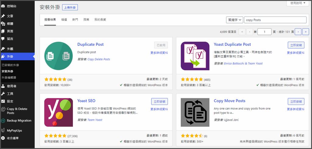 雖然說你看到的外掛名稱是 Duplicate Post,但是由於 Duplicate Post 外掛其實經過幾次更名,想要快速找到 Duplicate Post,搜尋的關鍵字反而建議是 copy posts。