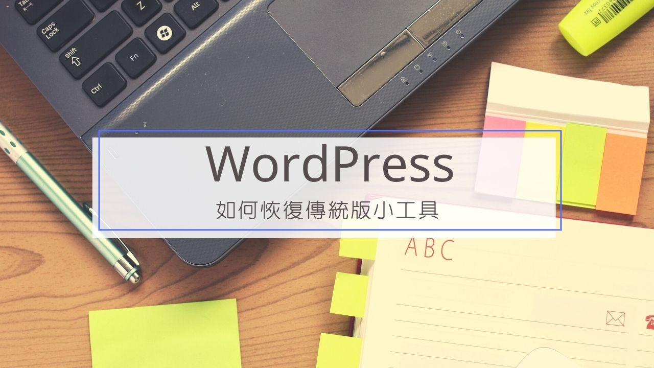 在 WordPress 更新到5.0之後,內容的更新方式都以古騰堡編輯器為主,隨著版本逐步更新,預設的小工具也預設為古騰堡的區塊編輯器,但是你可能還是使用不習慣,也可能是後台開啟的速度比原本的傳統小工具慢,但是也別太擔心,你還是有辦法暫時回復到原本的小工具編輯介面。