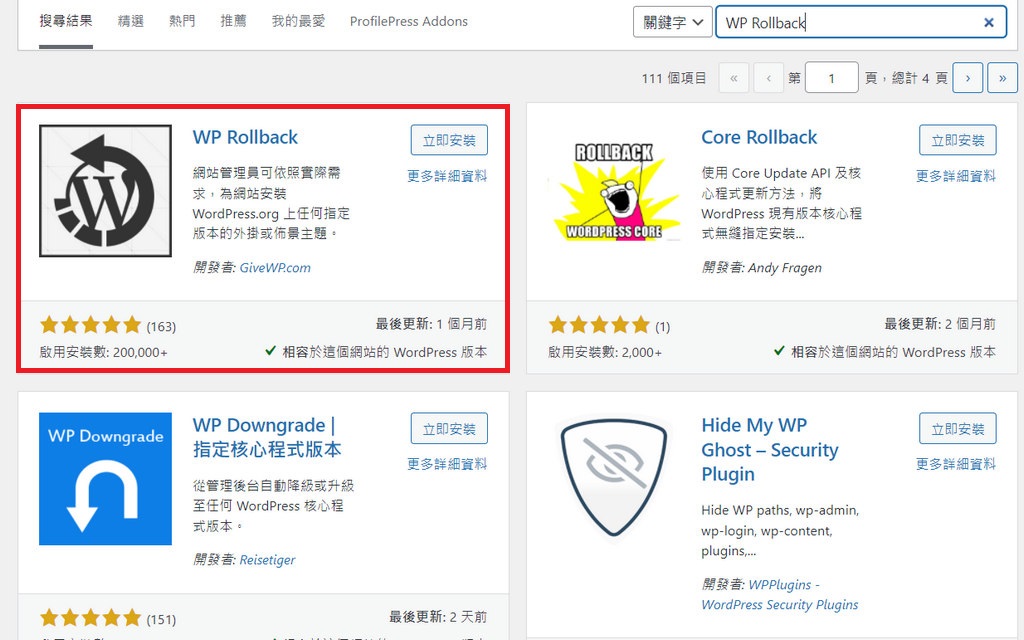 既然後台還進得去,那我這次還是在 WordPress 的後台來解決,先找到 WP Rollback 的外掛並安裝。