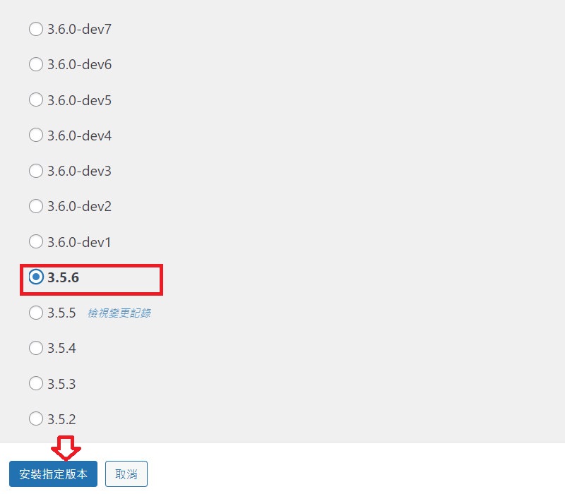 啟動 WP Rollback 之後,你在外掛或是主題的頁面中會看到出現一個”安裝指定版本”的按鈕。