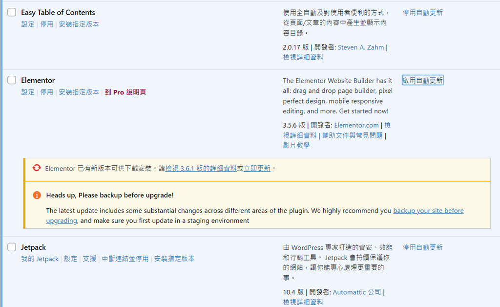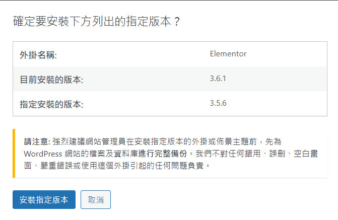 由於網站出現問題是在 Elementor 3.6.1,基於保險,我將版本退回到原本正常使用的3.5.6。